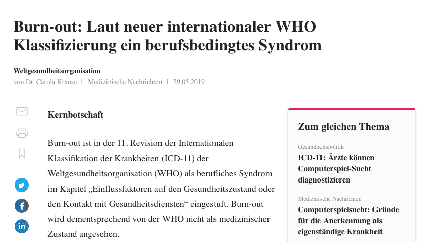 Nachdem die WHO am 25.05.2019 bereits veröffentlich hatte, dass Burnout nun offiziell als "Krankheit bedingt durch zu viel Stress am Arbeitsplatz" in den ICD-11 mit aufgenommen worden sei, wurde der Artikel am 26.05.2019 als Fehlermeldung zurückgezogen. Laut aktueller Veröffentlichung vom 29.05.2019 darf Burnout weiterhin nicht als Hauptdiagnose gestellt werden und wird "als berufliches Syndrom im Kapitel „Einflussfaktoren auf den Gesundheitszustand oder den Kontakt mit Gesundheitsdiensten“ eingestuft. Um mit den Krankenkassen abrechnen zu können, bleibt den Ärzten weiterhin nur die Diagnose "Depression". Dass die Ursache sich ausschließlich auf den beruflichen Kontext reduzieren soll kann ich leider nicht bestätigen. Ebenso ist Burnout noch lange keine Depression oder umgekehrt. Ich bin gespannt, wann es die ersten Pille gegen Burnout gibt, möglicherweise wird der Entwicklung dann mehr Beachtung geschenkt... Hier geht es zu dem ganzen Artikel: https://www.univadis.de/viewarticle/burn-out-laut-neuer-internationaler-who-klassifizierung-ein-beru...
